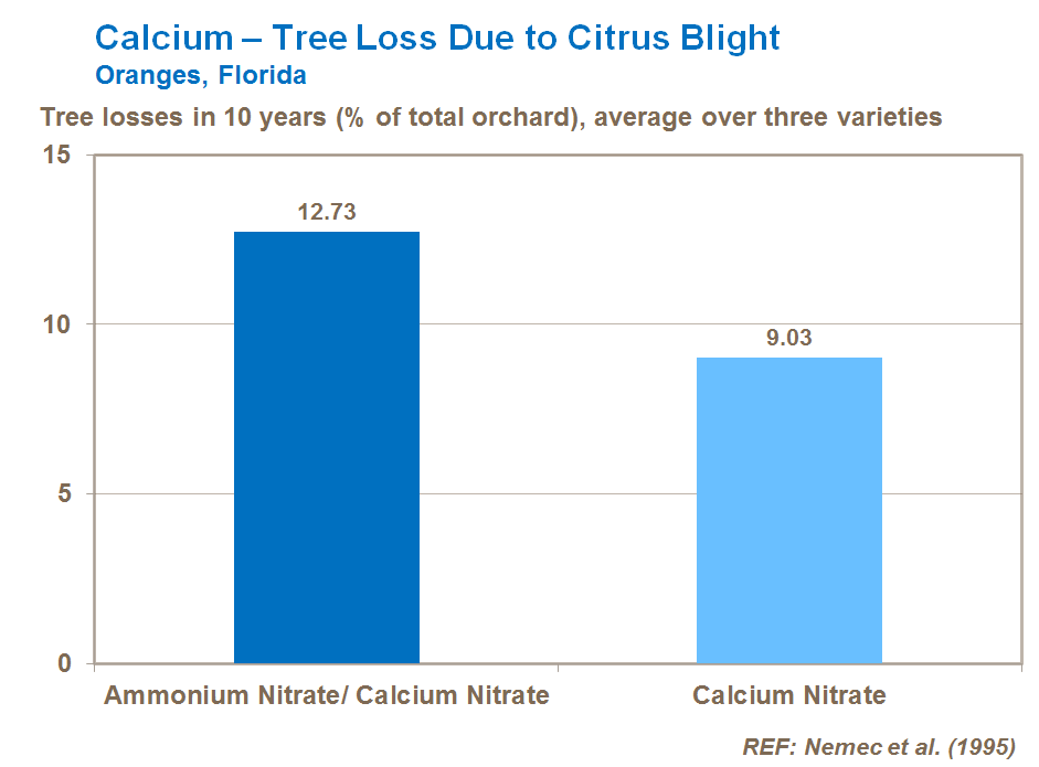 Research in Florida across three citrus varieties confirms that tree loss due to citrus blight is significantly lower where calcium nitrate is a major component of the fertilizer program. The most responsive variety was Hamlin where tree death was halved.