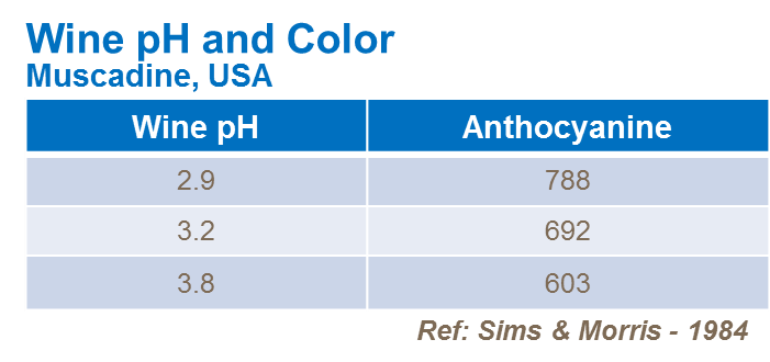 High pH values can also alter the color of anthocyanin solutions – responsible for red wine color - by changing the structure of the anthocyanin molecule, which becomes bluer and therefore less desirable.