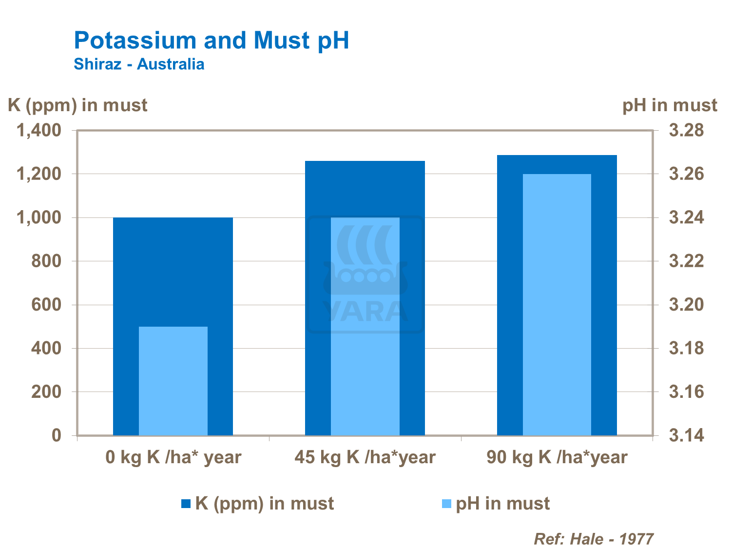 Excessive potassium can increase grape pH which influences the anthocyanins, reducing the intensity of the red coloration. Potassium has a direct effect on the pH level in the must.