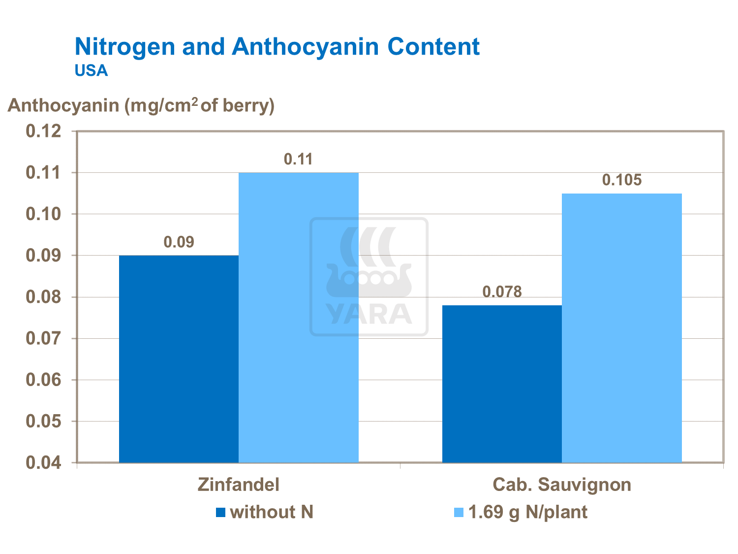 Increased nitrogen fertilization increases the anthocyanin content in the grape skin increasing the intensity of the color of the wine. But high nitrogen levels can create vigorous growth and shading, increasing berry size, thereby reducing the ratio of skin to pulp